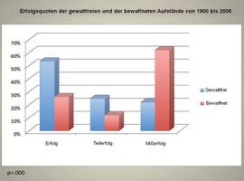 Ziviler Widerstand ist in 323 internationalen Konflikten doppelt so erfolgreich zur Erreichung politischer Ziele wie bewaffneter Widerstand. Die Wahrscheinlichkeit einer Demokratie fünf Jahre nach dem Konflikt ist zehnmal höher bei gewaltfreiem Vorgehen. (Untersuchungszeitraum: 1900 - 2005)