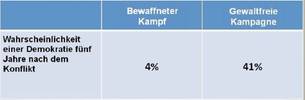 Die Wahrscheinlichkeit einer Demokratie fünf Jahre nach einem Konflikt ist demnach bei gewaltfreiem Vorgehen zehnmal höher als bei der Wahl gewaltvoller Mittel.