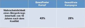 Die Wahrscheinlichkeit eines Bürgerkriegs zehn Jahre nach dem Konflikt ist bei der Wahl gewaltvoller Mittel fast doppelt so hoch wie bei der Wahl gewaltfreier Mittel zur Erreichung politischer Ziele.